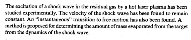 The excitation of a shock wave in the residual gas by a hot laser plasma has been studied experimentally. The velocity of the shock wave has been found to remain constant. An "instantaneous" transition to free motion has also been found. A method is proposed for determining the amount of mass evaporated from the target from the dynamics of the shock wave.