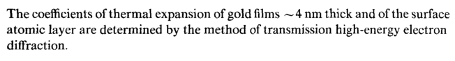 The coefficients of thermal expansion of gold films ~ 4 nm thick and of the surface atomic layer are determined by the method of transmission high-energy electron diffraction.