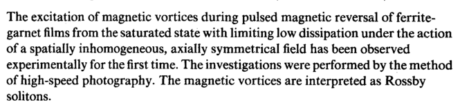 The excitation of magnetic vortices during pulsed magnetic reversal of ferrite-garnet films from the saturated state with limiting low dissipation under the action of a spatially inhomogeneous, axially symmetrical field has been observed experimentally for the first time. The investigations were performed by the method of high-speed photography. The magnetic vortices are interpreted as Rossby solitons.