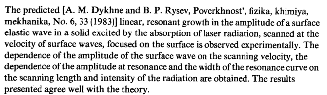 The predicted [A. M. Dykhne and B. P. Rysev, Poverkhnost', fizika, khimiya, mekhanika, No. 6, 33 (1983)] linear, resonant growth in the amplitude of a surface elastic wave in a solid excited by the absorption of laser radiation, scanned at the velocity of surface waves, focused on the surface is observed experimentally. The dependence of the amplitude of the surface wave on the scanning velocity, the dependence of the amplitude at resonance and the width of the resonance curve on the scanning length and intensity of the radiation are obtained. The results presented agree well with the theory.