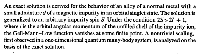 An exact solution is derived for the behavior of an alloy of a normal metal with a small admixture d of a magnetic impurity in an orbital singlet state. The solution is generalized to an arbitrary impurity spin S. Under the condition 2S>21 +1, where / is the orbital angular momentum of the unfilled shell of the impurity ion, the Gell-Mann-Low function vanishes at some finite point. A nontrivial scaling, first observed in a one-dimensional quantum many-body system, is analyzed on the basis of the exact solution.