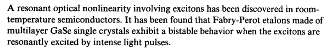 A resonant optical nonlinearity involving excitons has been discovered in room-temperature semiconductors. It has been found that Fabry-Perot etalons made of multilayer GaSe single crystals exhibit a bistable behavior when the excitons are resonantly excited by intense light pulses.