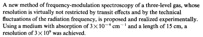 A new method of frequency-modulation spectroscopy of a three-level gas, whose resolution is virtually not restricted by transit effects and by the technical fluctuations of the radiation frequency, is proposed and realized experimentally. Using a medium with absorption of 3 χ 10-4 cm~1 and a length of 15 cm, a resolution of 3 Χ 109 was achieved.
