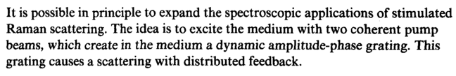 It is possible in principle to expand the spectroscopic applications of stimulated Raman scattering. The idea is to excite the medium with two coherent pump beams, which create in the medium a dynamic amplitude-phase grating. This grating causes a scattering with distributed feedback.