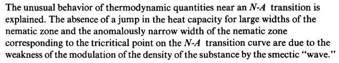 The unusual behavior of thermodynamic quantities near an N-A transition is explained. The absence of a jump in the heat capacity for large widths of the nematic zone and the anomalously narrow width of the nematic zone corresponding to the tricritical point on the N-A transition curve are due to the weakness of the modulation of the density of the substance by the smectic "wave."