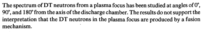 The spectrum of DT neutrons from a plasma focus has been studied at angles of 0°, 90°, and 180° from the axis of the discharge chamber. The results do not support the interpretation that the DT neutrons in the plasma focus are produced by a fusion mechanism.