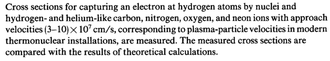 Cross sections for capturing an electron at hydrogen atoms by nuclei and hydrogenand helium-like carbon, nitrogen, oxygen, and neon ions with approach velocities (3-10) χ 107 cm/s, corresponding to plasma-particle velocities in modern thermonuclear installations, are measured. The measured cross sections are compared with the results of theoretical calculations.