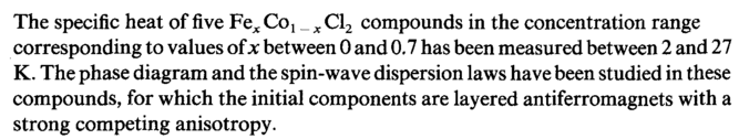 The specific heat of five Fex Col _ x Cl2 compounds in the concentration range corresponding to values of л: between 0 and 0.7 has been measured between 2 and 27 K. The phase diagram and the spin-wave dispersion laws have been studied in these compounds, for which the initial components are layered antiferromagnets with a strong competing anisotropy.