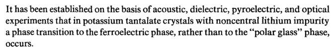 It has been established on the basis of acoustic, dielectric, pyroelectric, and optical experiments that in potassium tantalate crystals with noncentral lithium impurity a phase transition to the ferroelectric phase, rather than to the "polar glass" phase, occurs.