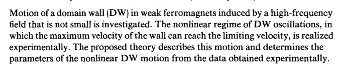 Motion of a domain wall (DW) in weak ferromagnets induced by a high-frequency field that is not small is investigated. The nonlinear regime of DW oscillations, in which the maximum velocity of the wall can reach the limiting velocity, is realized experimentally. The proposed theory describes this motion and determines the parameters of the nonlinear DW motion from the data obtained experimentally.