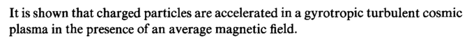 It is shown that charged particles are accelerated in a gyrotropic turbulent cosmic plasma in the presence of an average magnetic field.