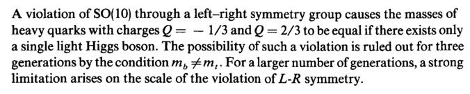 A violation of SO(10) through a left-right symmetry group causes the masses of heavy quarks with charges Q ~ — 1/3 and Q — 2/3 to be equal if there exists only a single light Higgs boson. The possibility of such a violation is ruled out for three generations by the condition ÔØÆÔÇ. For a larger number of generations, a strong limitation arises on the scale of the violation of L-R symmetry.