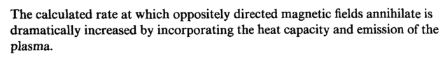 The calculated rate at which oppositely directed magnetic fields annihilate is dramatically increased by incorporating the heat capacity and emission of the plasma.