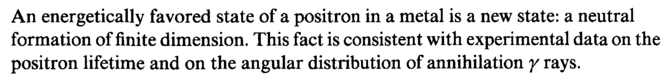 An energetically favored state of a positron in a metal is a new state: a neutral formation of finite dimension. This fact is consistent with experimental data on the positron lifetime and on the angular distribution of annihilation γ rays.