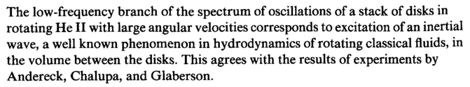 The low-frequency branch of the spectrum of oscillations of a stack of disks in rotating He II with large angular velocities corresponds to excitation of an inertial wave, a well known phenomenon in hydrodynamics of rotating classical fluids, in the volume between the disks. This agrees with the results of experiments by Andereck, Chalupa, and Glaberson.