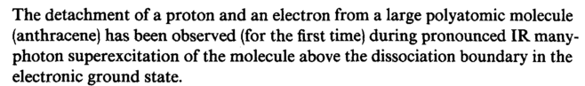 The detachment of a proton and an electron from a large polyatomic molecule (anthracene) has been observed (for the first time) during pronounced IR many-photon superexcitation of the molecule above the dissociation boundary in the electronic ground state.