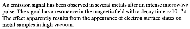 An emission signal has been observed in several metals after an intense microwave pulse. The signal has a resonance in the magnetic field with a decay time ~10~4 s. The effect apparently results from the appearance of electron surface states on metal samples in high vacuum.