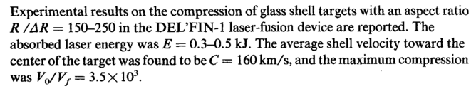 Experimental results on the compression of glass shell targets with an aspect ratio R /AR — 150-250 in the DELTIN-1 laser-fusion device are reported. The absorbed laser energy was Ε = 0.3-0.5 к J. The average shell velocity toward the center of the target was found to be С = 160 km/s, and the maximum compression was F0/F/ = 3.5X103.