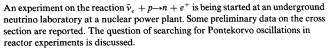An experiment on the reaction ve + p-*n + e+ is being started at an underground neutrino laboratory at a nuclear power plant. Some preliminary data on the cross section are reported. The question of searching for Pontekorvo oscillations in reactor experiments is discussed.