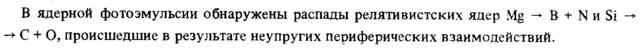 В ядерной фотоэмульсии обнаружены распады релятивистских ядер Mg -*■ В + N и Si -+ С + О, происшедшие в результате неупругих периферических взаимодействий.