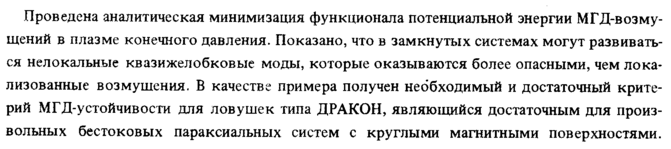 Проведена аналитическая минимизация функционала потенциальной энергии МГД-возму-щений в плазме конечного давления. Показано, что в замкнутых системах могут развиваться нелокальные квазижелобковые моды, которые оказываются более опасными, чем локализованные возмущения. В качестве примера получен необходимый и достаточный критерий МГД-устойчивости для ловушек типа ДРАКОН, являющийся достаточным для произвольных бестоковых параксиальных систем с круглыми магнитными поверхностями.