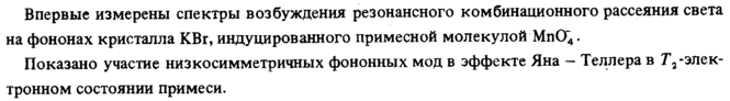 Впервые измерены спектры возбуждения резонансного комбинационного рассеяния света на фононах кристалла КВг, индуцированного примесной молекулой МпСГ4. Показано участие низкосимметричных фононных мод в эффекте Яна Теллера в Т7-электронном состоянии примеси.
