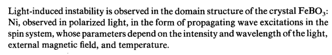 Light-induced instability is observed in the domain structure of the crystal FeB03: Ni, observed in polarized light, in the form of propagating wave excitations in the spin system, whose parameters depend on the intensity and wavelength of the light, external magnetic field, and temperature.