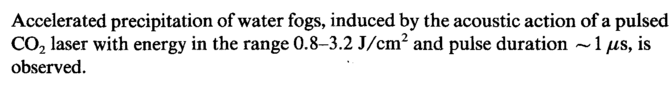 Accelerated precipitation of water fogs, induced by the acoustic action of a pulsed C02 laser with energy in the range 0.8-3.2 J/cm2 and pulse duration ~ 1 μ$, is observed.
