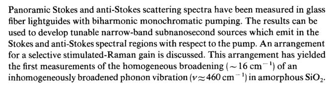 Panoramic Stokes and anti-Stokes scattering spectra have been measured in glass fiber lightguides with biharmonic monochromatic pumping. The results can be used to develop tunable narrow-band subnanosecond sources which emit in the Stokes and anti-Stokes spectral regions with respect to the pump. An arrangement for a selective stimulated-Raman gain is discussed. This arrangement has yielded the first measurements of the homogeneous broadening (~ 16 cm"1) of an inhomogeneously broadened phonon vibration (v~460 cm" *) in amorphous Si02.