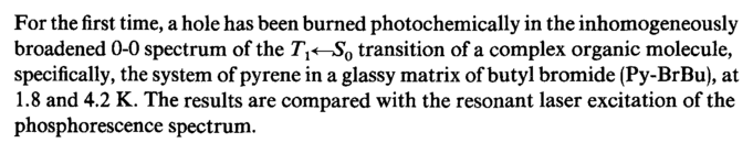 For the first time, a hole has been burned photochemically in the inhomogeneously broadened 0-0 spectrum of the Ti<—S0transition of a complex organic molecule, specifically, the system of pyrene in a glassy matrix of butyl bromide (Py-BrBu), at 1.8 and 4.2 K. The results are compared with the resonant laser excitation of the phosphorescence spectrum.