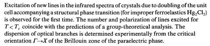 Excitation of new lines in the infrared spectra of crystals due to doubling of the unit cell accompanying a structural phase transition (for improper ferroelastics Hg2Cl2) is observed for the first time. The number and polarization of lines excited for T< Tc coincide with the predictions of a group-theoretical analysis. The dispersion of optical branches is determined experimentally from the critical orientation Γ-^Χ of the Brillouin zone of the paraelectric phase.