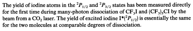 The yield of iodine atoms in the 2PU2 and 2P3/2 states has been measured directly for the first time during many-photon dissociation of CF3I and (CF3)3CI by the beam from a C02 laser. The yield of excited iodine 1*(2Л/г) *s essentially the same for the two molecules at comparable degrees of dissociation.