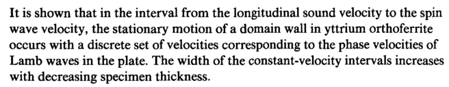 It is shown that in the interval from the longitudinal sound velocity to the spin wave velocity, the stationary motion of a domain wall in yttrium orthoferrite occurs with a discrete set of velocities corresponding to the phase velocities of Lamb waves in the plate. The width of the constant-velocity intervals increases with decreasing specimen thickness.