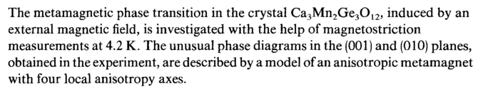 The metamagnetic phase transition in the crystal Ca3Mn2Ge3012, induced by an external magnetic field, is investigated with the help of magnetostriction measurements at 4.2 K. The unusual phase diagrams in the (001) and (010) planes, obtained in the experiment, are described by a model of an anisotropic metamagnet with four local anisotropy axes.