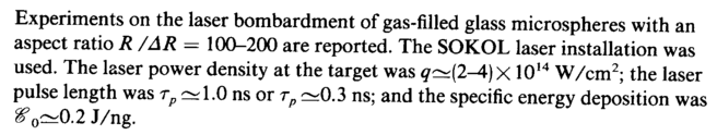 Experiments on the laser bombardment of gas-filled glass microspheres with an aspect ratio R /ЛЯ = 100-200 are reported. The SOKOL laser installation was used. The laser power density at the target was qc^(2-4) χ 1014 W/cm2; the laser pulse length was rp~l.Q ns or rp ~0.3 ns; and the specific energy deposition was Го-0.2 J/ng.