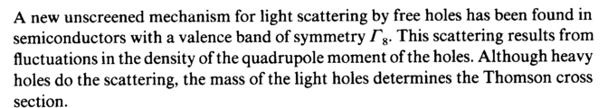 A new unscreened mechanism for light scattering by free holes has been found in semiconductors with a valence band of symmetry jT8. This scattering results from fluctuations in the density of the quadrupole moment of the holes. Although heavy holes do the scattering, the mass of the light holes determines the Thomson cross section.