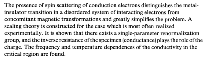 The presence of spin scattering of conduction electrons distinguishes the metal-insulator transition in a disordered system of interacting electrons from concomitant magnetic transformations and greatly simplifies the problem. A scaling theory is constructed for the case which is most often realized experimentally. It is shown that there exists a single-parameter renormalization group, and the inverse resistance of the specimen (conductance) plays the role of the charge. The frequency and temperature dependences of the conductivity in the critical region are found.