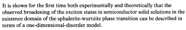 It is shown for the first time both experimentally and theoretically that the observed broadening of the exciton states in semiconductor solid solutions in the existence domain of the sphalerite-wurtzite phase transition can be described in terms of a one-dimensional-disorder model.