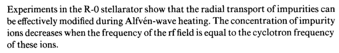 Experiments in the R-0 stellarator show that the radial transport of impurities can be effectively modified during Alfven-wave heating. The concentration of impurity ions decreases when the frequency of the rf field is equal to the cyclotron frequency of these ions.