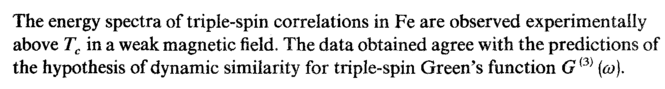 The energy spectra of triple-spin correlations in Fe are observed experimentally above Tc in a weak magnetic field. The data obtained agree with the predictions of the hypothesis of dynamic similarity for triple-spin Green's function Gi3} (ω).