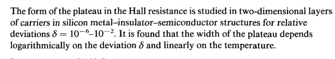 The form of the plateau in the Hall resistance is studied in two-dimensional layers of carriers in silicon metal-insulator-semiconductor structures for relative deviations δ — 10~6-10~2. It is found that the width of the plateau depends logarithmically on the deviation δ and linearly on the temperature.