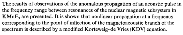 The results of observations of the anomalous propagation of an acoustic pulse in the frequency range between resonances of the nuclear magnetic subsystem in KMnF3 are presented. It is shown that nonlinear propagation at a frequency corresponding to the point of inflection of the magnetoacoustic branch of the spectrum is described by a modified Korteweig-de Vries (KDV) equation.