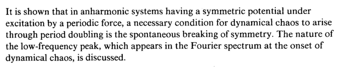 It is shown that in anharmonic systems having a symmetric potential under excitation by a periodic force, a necessary condition for dynamical chaos to arise through period doubling is the spontaneous breaking of symmetry. The nature of the low-frequency peak, which appears in the Fourier spectrum at the onset of dynamical chaos, is discussed.