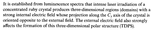It is established from luminescence spectra that intense laser irradiation of a concentrated ruby crystal produces three-dimensional regions (domains) with a strong internal electric field whose projection along the C3 axis of the crystal is oriented opposite to the external field. The external electric field also strongly affects the formation of this three-dimensional polar structure (TDPS).