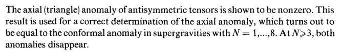 The axial (triangle) anomaly of antisymmetric tensors is shown to be nonzero. This result is used for a correct determination of the axial anomaly, which turns out to be equal to the conformal anomaly in supergravities with N = 1,...,8. At7V>3, both anomalies disappear,