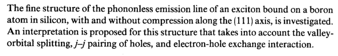 The fine structure of the phononless emission line of an exciton bound on a boron atom in silicon, with and without compression along the (111) axis, is investigated. An interpretation is proposed for this structure that takes into account the valley-orbital splitting, j-j pairing of holes, and electron-hole exchange interaction.