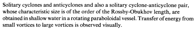 Solitary cyclones and anticyclones and also a solitary cyclone-anticyclone pair, whose characteristic size is of the order of the Rossby-Obukhov length, are obtained in shallow water in a rotating paraboloidal vessel. Transfer of energy from small vortices to large vortices is observed visually.