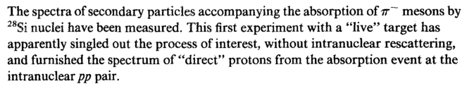 The spectra of secondary particles accompanying the absorption of тг~ mesons by 28Si nuclei have been measured. This first experiment with a "live" target has apparently singled out the process of interest, without intranuclear rescattering, and furnished the spectrum of "direct" protons from the absorption event at the intranuclear pp pair.