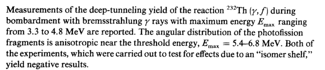 Measurements of the deep-tunneling yield of the reaction 232Th (y,f) during bombardment with bremsstrahlung γ rays with maximum energy Emax ranging from 3.3 to 4.8 MeV are reported. The angular distribution of the photofission fragments is anisotropic near the threshold energy, Emax = 5.4-6.8 MeV. Both of the experiments, which were carried out to test for effects due to an "isomer shelf," yield negative results.