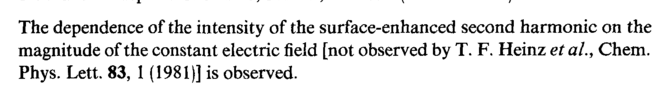 The dependence of the intensity of the surface-enhanced second harmonic on the magnitude of the constant electric field [not observed by T. F. Heinz et ah, Chem. Phys. Lett. 83, 1 (1981)] is observed.